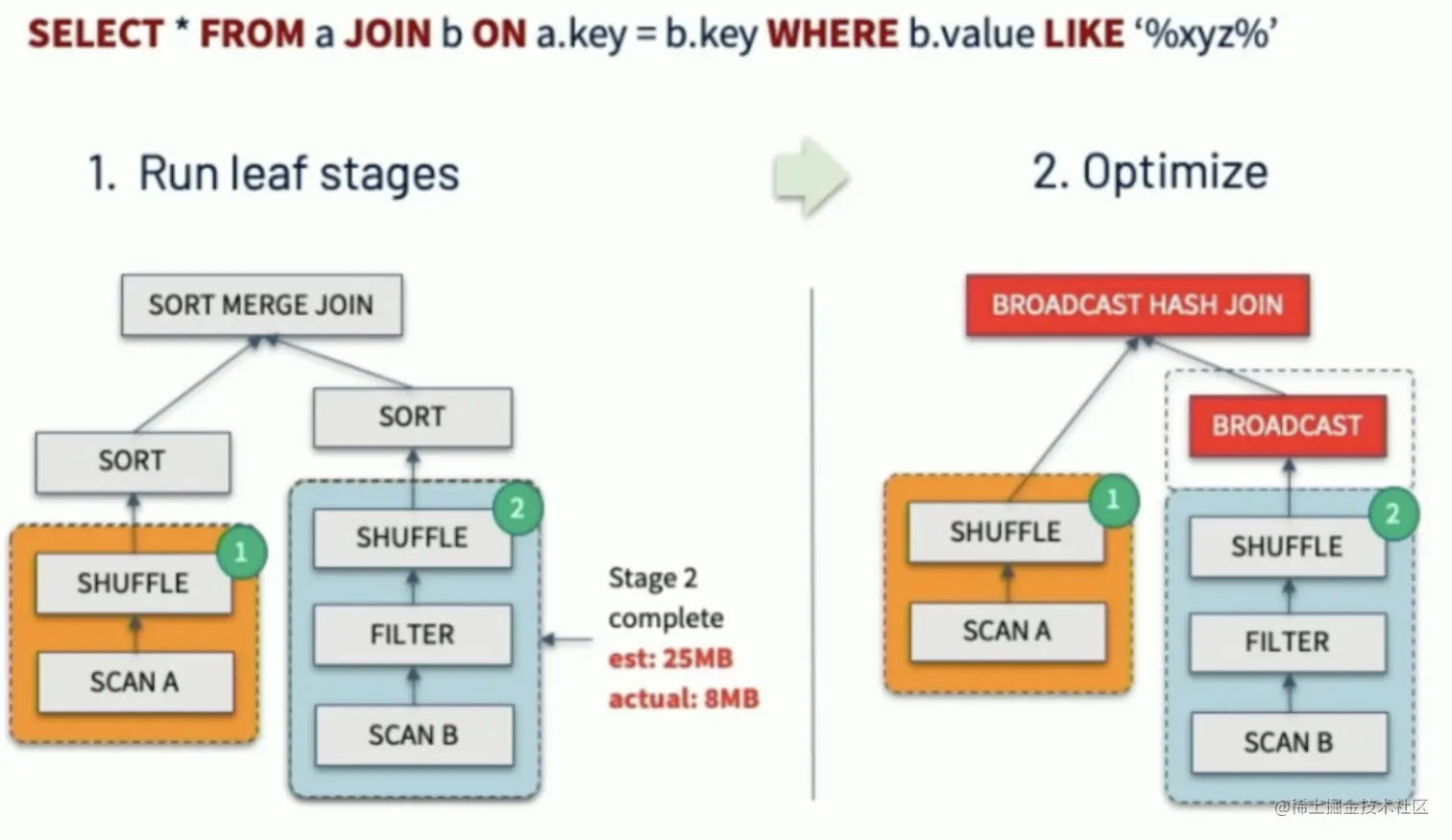 solution: AQE运行过程中动态获取准确Join的leftChild/rightChild的实际大小,将SortMergeJoin (SMJ) 转化为BroadcastHashJoin (BHJ)