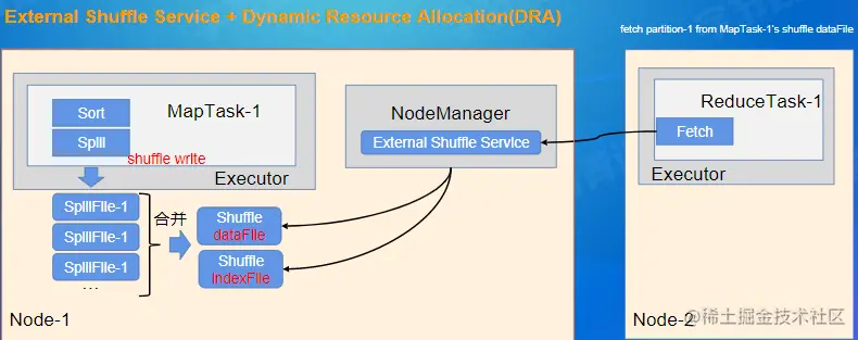 shuffle write的文件被NodeManage r中的Shuffle Service托管,供后续Reduce Task进行shuffle fetch,如果Executor空闲,DRA可以进行回收