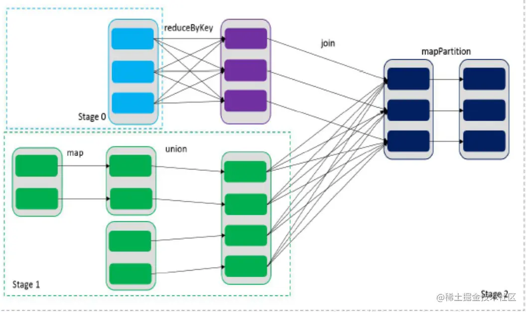 从后往前推,遇到宽依赖就断开,划分为一个Stage。