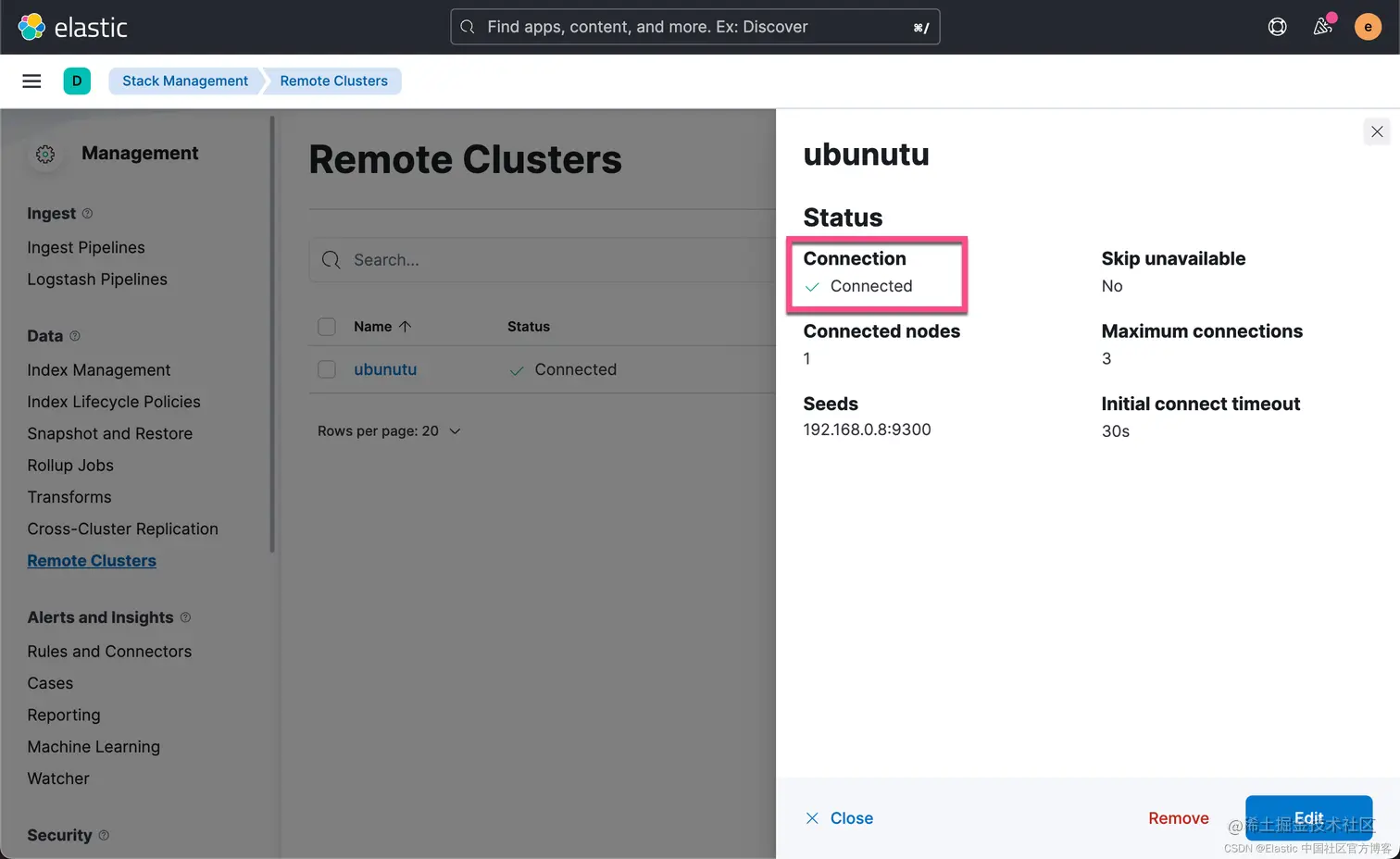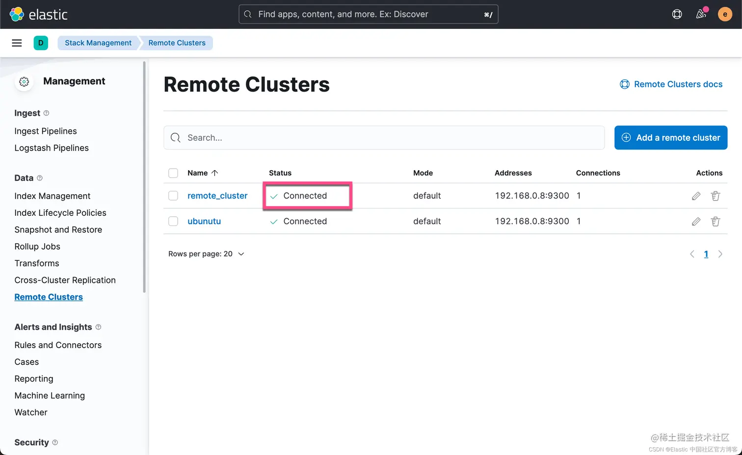 上面显示我们的连接是成功的。当然,我们也可以在 Kibana 的界面中进行查看:
