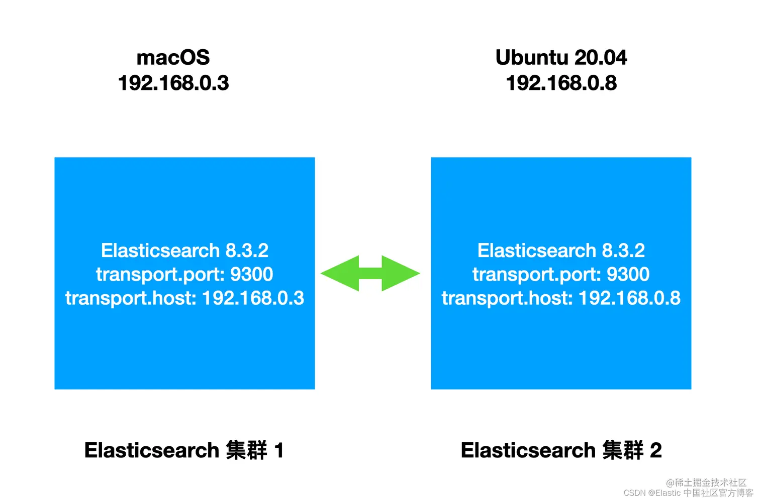 如上所示,我有两个单节点的集群。它们分别位于两个不同的机器上。为了能够让它们建立互相,我们必须按照上面的方式来进行配置。