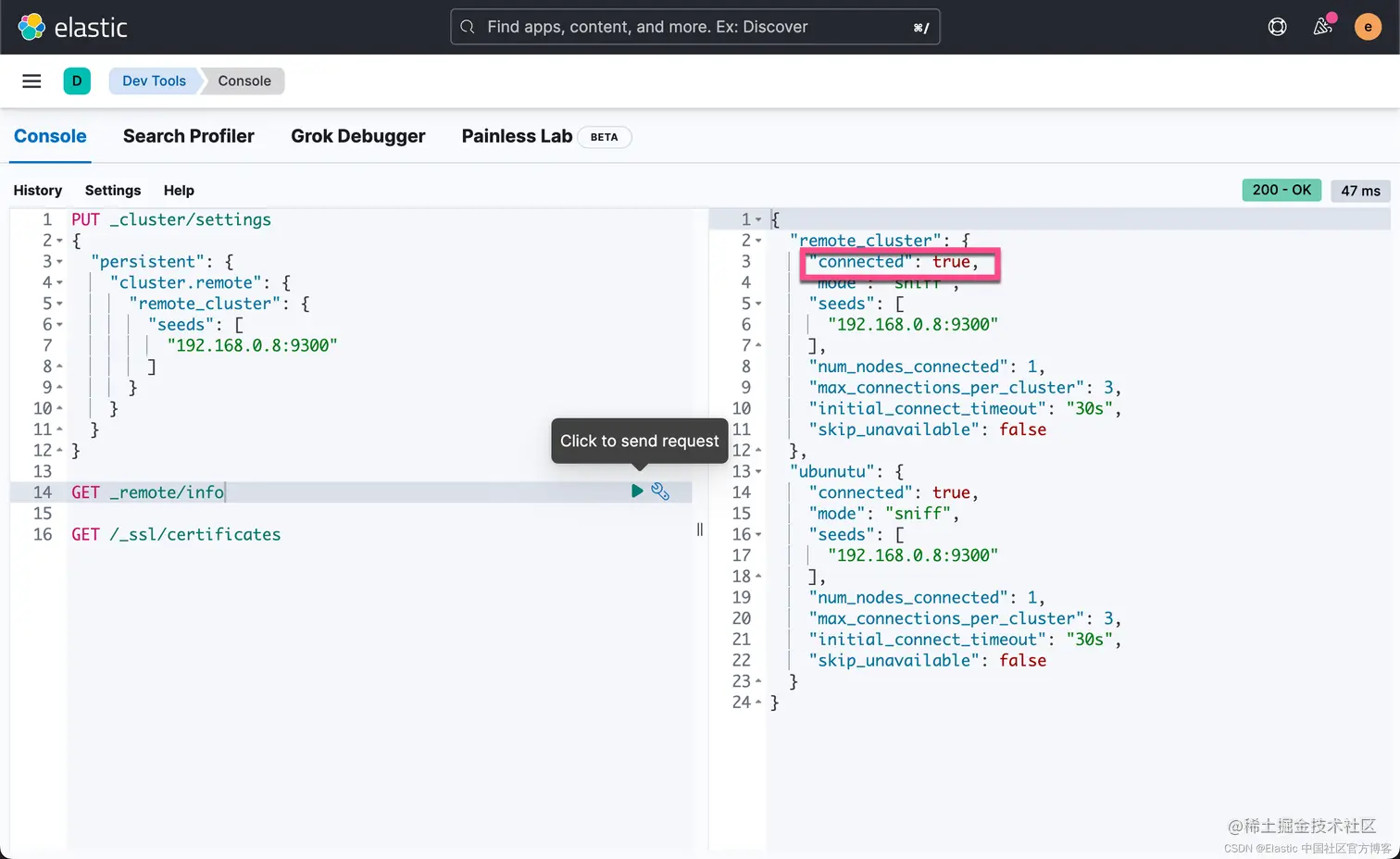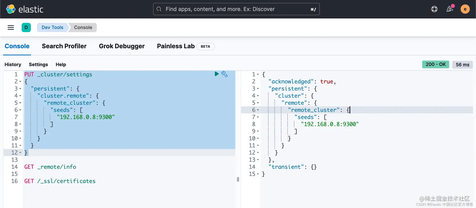 - 从本地群集中将 CA 证书添加为每个远程群集中的受信任 CA(请参阅传输 TLS 设置)。如果你是两个不同证书的集群,你可以在 elasticsearch.yml 中的 xpack.security.transport.ssl.certificate_authorities 添加对方的证书而得到受信,或者通过添加证书到 truststore 来实现。