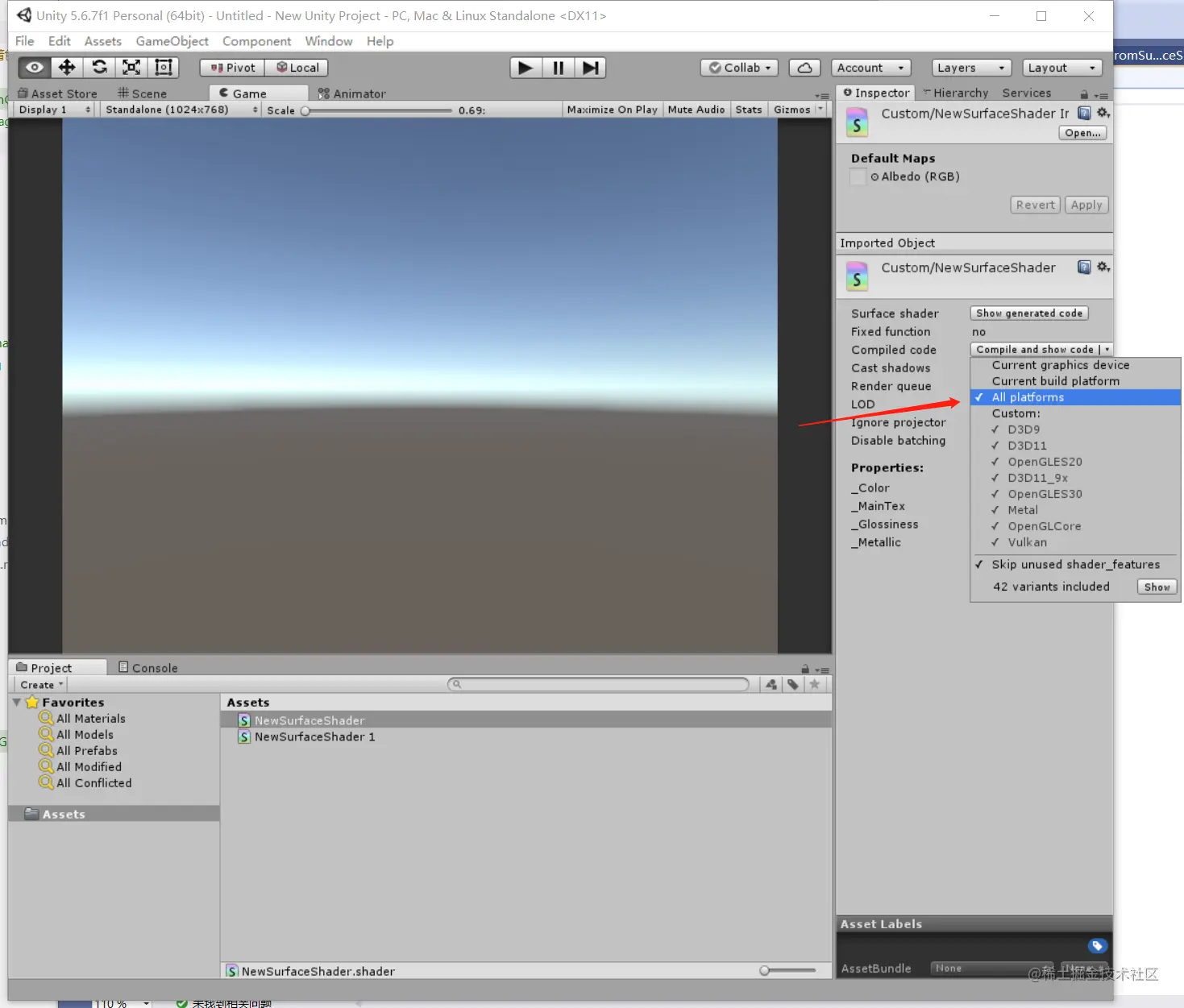 Unity中选中创建的Shader,在Inspector里,打开Shader编译平台设置,修改为 All platforms。