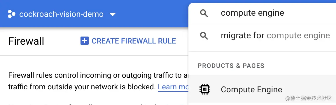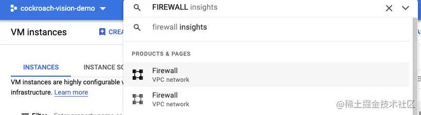在顶部的搜索框中,输入 "防火墙",并在 "VPC网络 "下选择匹配的建议 "防火墙"