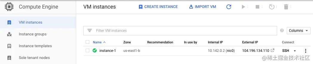 1. 切换回控制台视图,查看 "Compute Engine "下的 "VM Instances"。 我们的外部IP地址就列在我们的实例旁边。