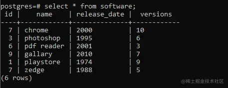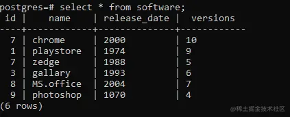要从表中删除数据,你必须有一个已经创建的表。在文章的后面,我们已经讨论了在各自的例子中创建和插入表的方法。总之,现在考虑一个例子,我们创建了一个名为软件的假表。它包含了软件的所有属性。为了显示该表的值,你需要一个带有 "*"的选择命令。这个符号意味着所有的数据。