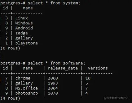 如果我们想检查留在两个表中的数据,通过选择语句进行检查。你可以看到 "软件 "表中的记录被删除了,而 "系统 "表中的记录却完好无损。这意味着'系统'表只用于参考。