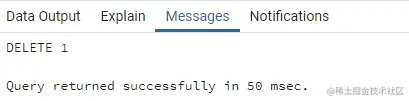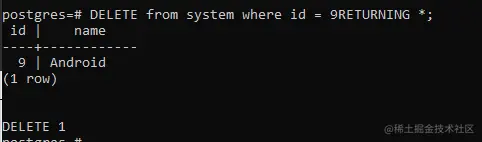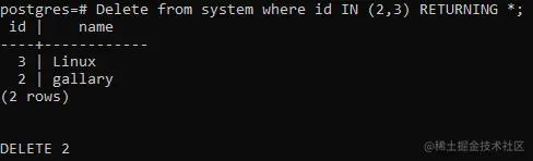 你可以看到,有9个id的行被删除,并显示为查询的结果。同样地,我们还有一个例子,其中选择了两行。这些行被写在一个括号内的单一命令中。语法有点不同,因为它涉及到在命令中添加 "IN"。这条命令写成这样。