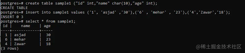 在走向一些困难的概念之前。下面是一些创建表,插入值,然后应用有两个条件的删除命令的示例情况。创建了名为 "sample1 "的表。每一列的名称都有它要用来接收数值的数据类型。让我们看看它是如何工作的。
