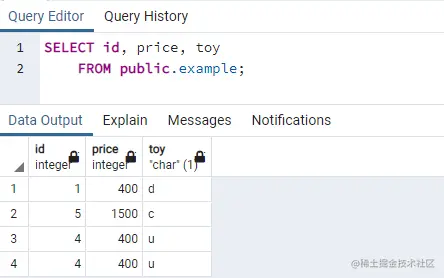postgresql的仪表板是 "pgAdmin"。我们也可以在pgAdmin中应用同样的查询。在提供密码后,导航到左边的导航栏,选择数据库名称,然后进入 "查询工具"。在这里你可以写查询。通过选择命令显示假表'sample'的数据。