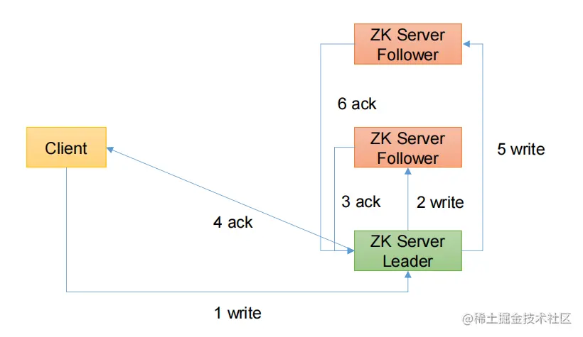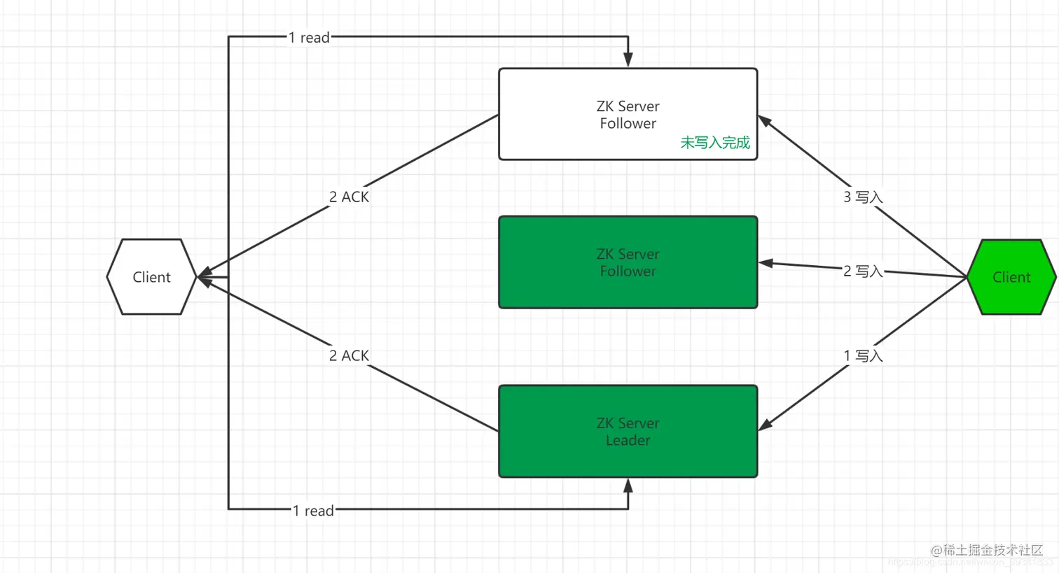 - 当Leader接收到一半以上节点(包含自己)返回写成功的信息之后,表示写入成功。如上图接收到自己以及23箭头的follower节点的写成功消息,超过一半了