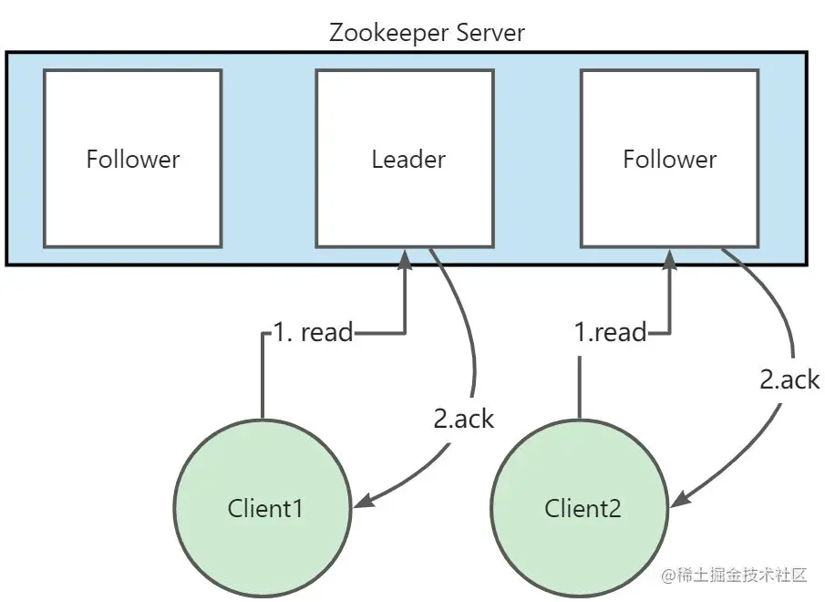 Zookeeper读过程相对简单,客户端Client和server端建立连接后,这个server节点无论时Leader 还是 Follower ,Client发出读请求之后,都会直接返回结果。