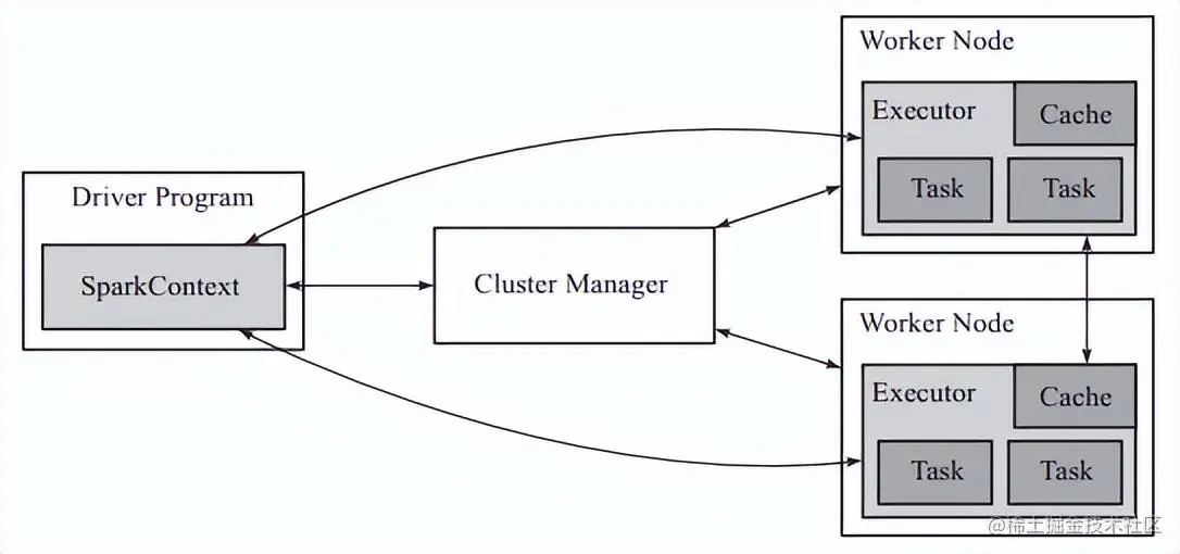 具体来说,当在集群上执行一个应用时,SparkContext可以连接到集群资源管理器(如YARN),获取集群的Worker Node的Executor,然后将应用程序代码上传到Executor中,再将Task发送给Executor运行。