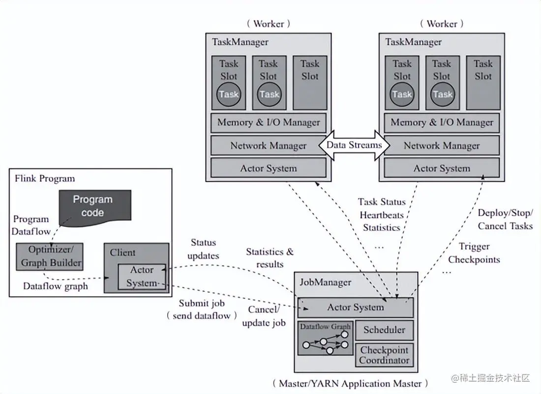 - TaskManager,也称为Worker,负责执行数据处理流(dataflow)的任务,并缓冲和交换数据流。TaskManager中资源调度的最小单位是任务槽(slot),TaskManager中slot的数量代表并发处理任务的数量。