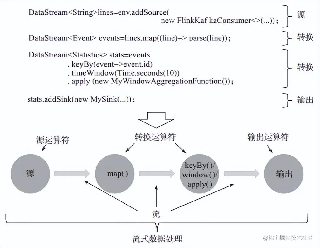 流处理是对没有边界数据流的处理。执行时,应用程序映射到由流和转换运算符组成的流式数据处理流。这些数据流形成有向图,以一个或多个源(source)开始,以一个或多个输出(sink)结束。程序中的转换与运算符之间通常是一对一的关系,但有时一个转换可以包含多个运算符。Flink流式处理步骤示例如图5所示。
