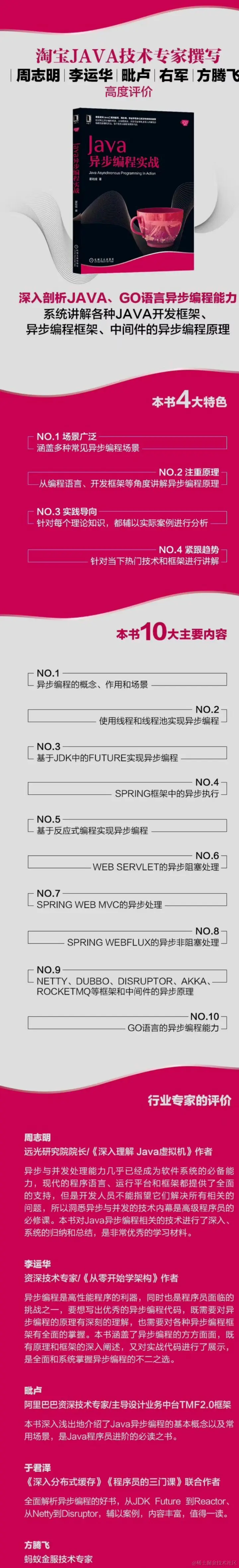 - 本文从编程框架和编程语言等维度讲解了如何进行异步编程,比如SpringWebFlux和Dubbo等框架,以及Java和Go等语言。相信大家在看完本书之后,能够全方位、立体化掌握异步编程的技巧。