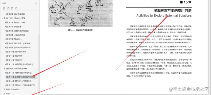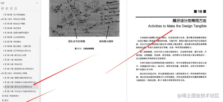 **第16章展示设计的常用方法;**介绍架构光靠嘴巴讲是不够的,应该设法展示出来。展示模式把抽象的想法(如设计概念)转变成可感知的对象,方便分享。将设计展示出来不但可以促进交流,而且可以用来检查设计能在多大程度上满足需求。设法展示的过程也是推演架构的过程。即使只是制作设计草稿,也是一种有用的思维练习。
