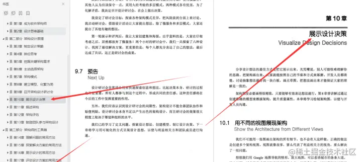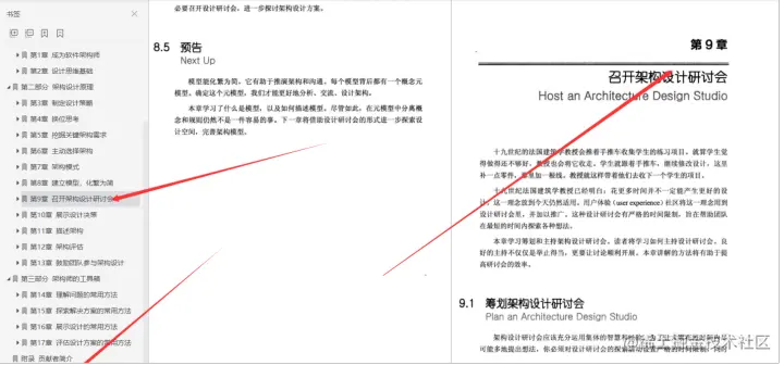 **第9章召开架构设计研讨会;**本章学习筹划和主持架构设计研讨会。读者将学习如何主持设计研讨会。良好的主持不仅仅是举止得当,更要让讨论顺利开展。本章讲解的方法将有助于提高研讨会的效率。