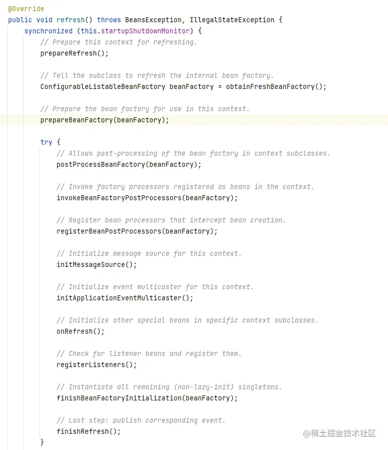 Spring中核心的方法在AbstractApplicationContext的refresh()中的12个方法,如图