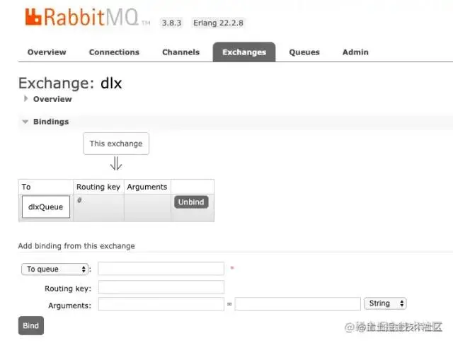 先在RabbitMQ控制台创建一个名为dlx的交换机,作为死信交换机,并绑定上一个dlxQueue队列,作为Dead-Letter-Queue