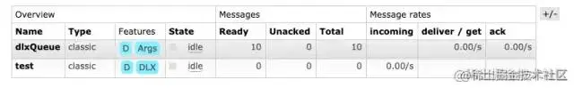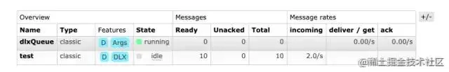 q, err := ch.QueueDeclare("test", true, false, false, false, args) // 声明一个test队列,并设置队列的死信交换机为"dlx"