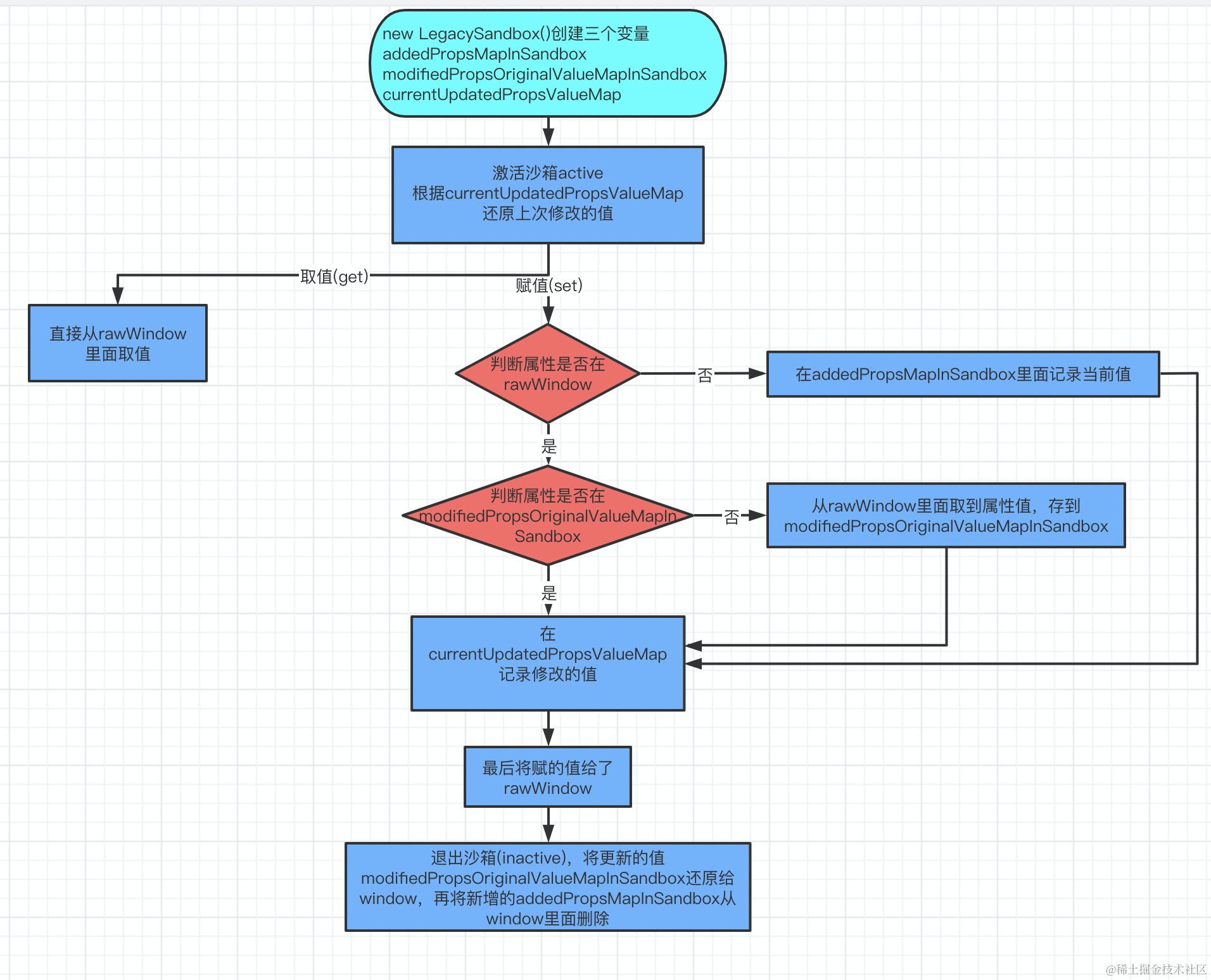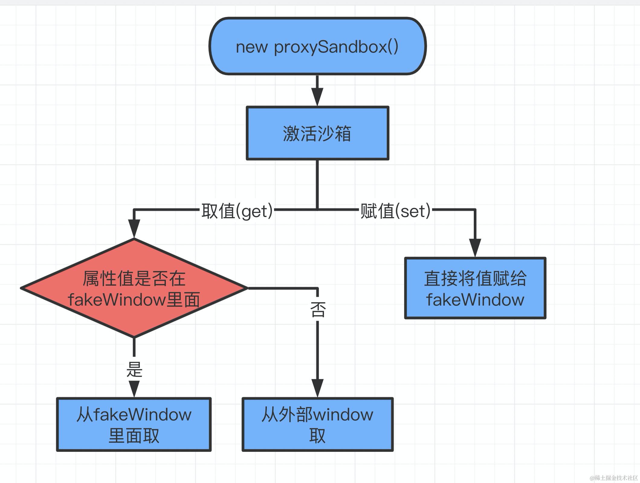 legacySandbox 单例沙箱还是会对 window 进行操作,且 fakeWindow 并没有发挥作用,proxySandbox 改进了这一点,关注点在于 fakeWindow,对 fakeWindow 进行代理。激活沙箱后,先找自己沙箱环境的 fakeWindow ,如果找不到,则去外部环境 rawWindow 进行查找;当对沙箱内部的 window 对象赋值的时候,会直接操作 fakeWindow,而不会影响到 rawWindow。