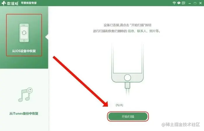 第一步:将需要恢复数据的手机与电脑连接,打开软件,根据软件的提示选择【从iOS设备中恢复】模式,点击【开始扫描】对我们的手机进行深度扫描。