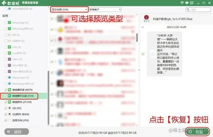 之后在中间列表中,勾选我们想要恢复的好友聊天记录,最后点击【恢复】按钮,将需要的对话内容导出到电脑,完成恢复操作。