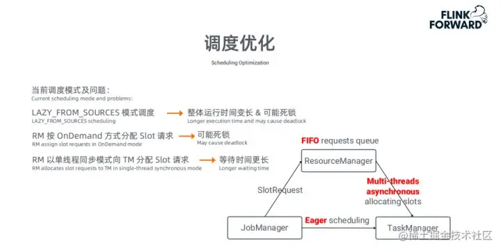 注:调度死锁是指在资源有限的情况下,多个Job同时运行时,如果多个Job都只申请到了部分资源并没有剩余资源可以申请,导致Job没法继续执行,新的Job也没法提交 - RM ( Resource Manager ) 按OnDemand方式分配Slot需求,也会造成死锁