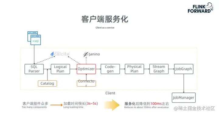在改动之前,每次接受一个query时会启动一个新的JVM进程来进行作业的编译。其中JVM的启动、Class的加载、代码的动态编译 ( 如Optimizer模块由于需要通过Janino动态编译进行cost计算 ) 等操作都非常耗时 ( 需要约3~5s )。因此,我们将客户端进行服务化,将整个Client做成Service,当接收到用户的query时,无需重复各项加载工作,可将延时降低至100ms 左右。