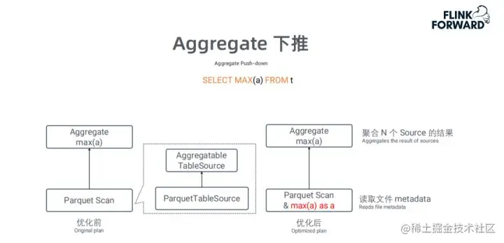 这个优化也是充分利用了TableSource的特性:例如Parquet文件的metadata中已经存储了每个RowGroup的统计信息 ( 如 max、min等 ),因此在做max、min这类聚合统计时,可直接读取metadata信息,而不需要先读取所有原始数据再计算。