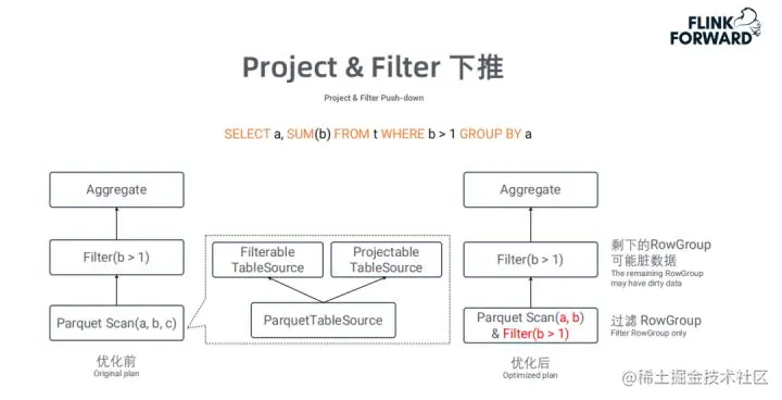 像Parquet这类的列存文件格式,支持按需读取相所需列,同时支持RowGroup级别的过滤。利用该特性,可以将Project和Filter下推到TableSource,从而只需要扫描Query中涉及的字段和满足条件的RowGroup,大大提升读取效率。