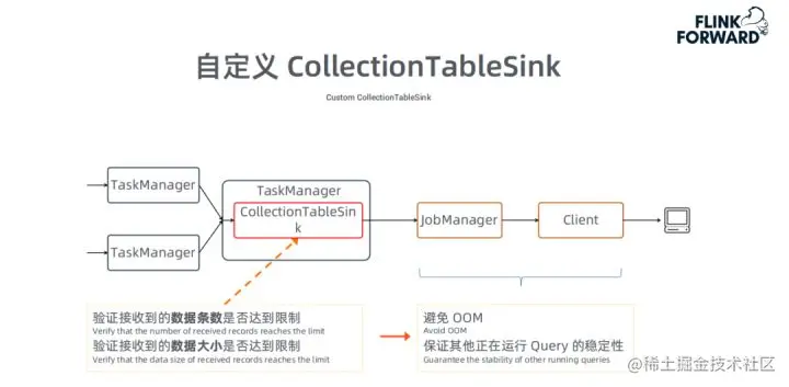 这部分优化,源于OLAP的一个特性:OLAP会将最终计算结果发给客户端,通过JobManager转发给Client。假如某个query的结果数据量很大,会让JobManager OOM ( OutOfMemory );如果同时执行多个query,也会相互影响。因此,我们从新实现了一个CollectionTableSink,限制数据的条数和数据大小,避免出现OOM,保证多个Query同时运行时的稳定性。