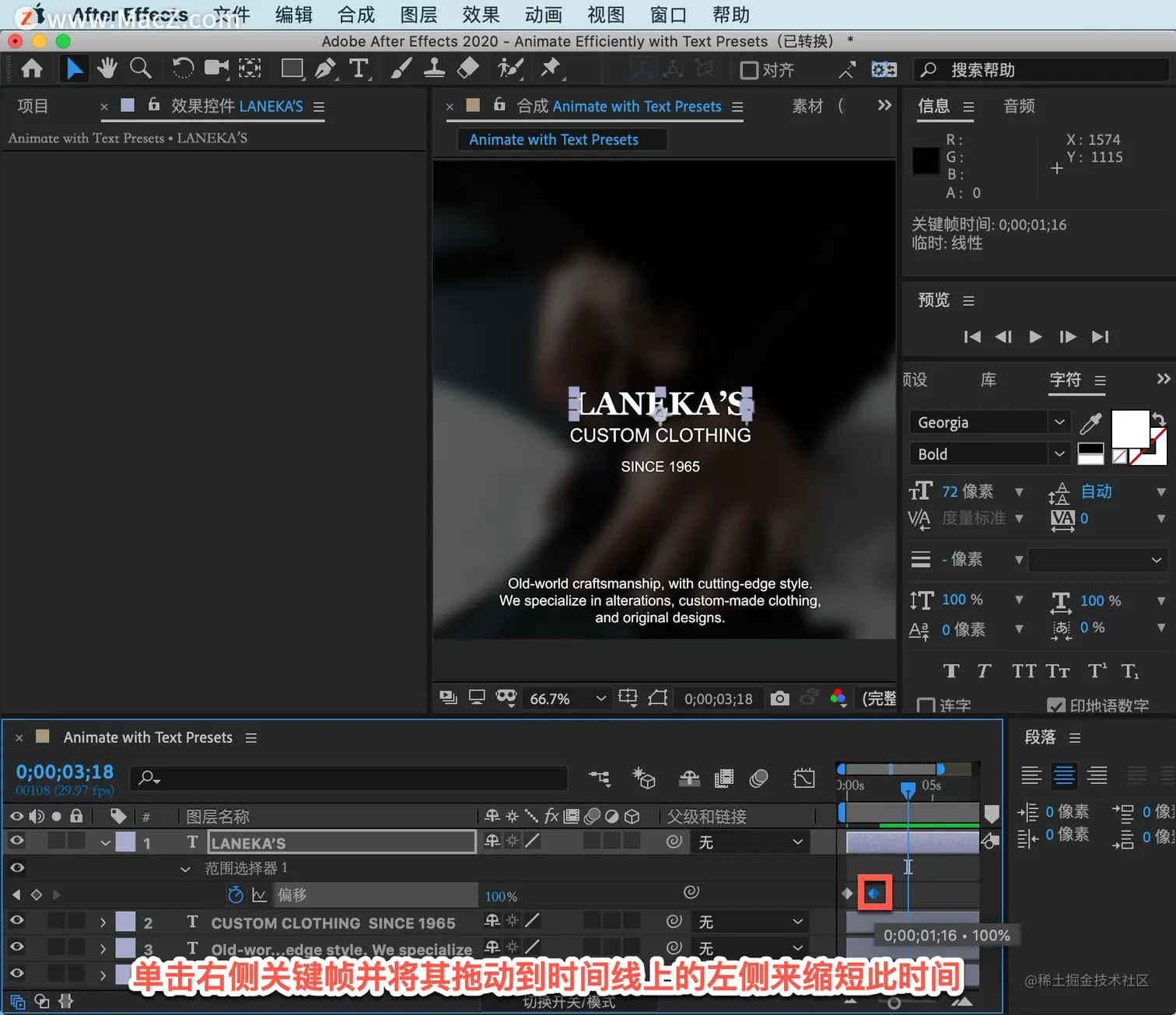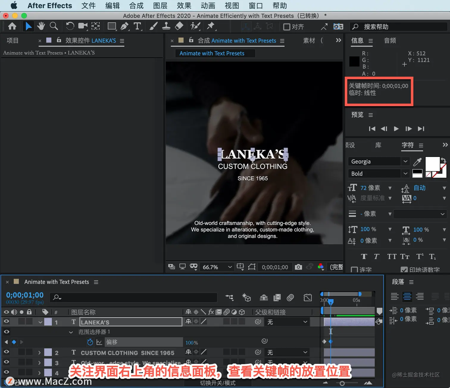 关注界面右上角的信息面板,查看关键帧的放置位置。在第一秒钟制作这个动画,当它达到 0 时,立即停止 00;01;0。