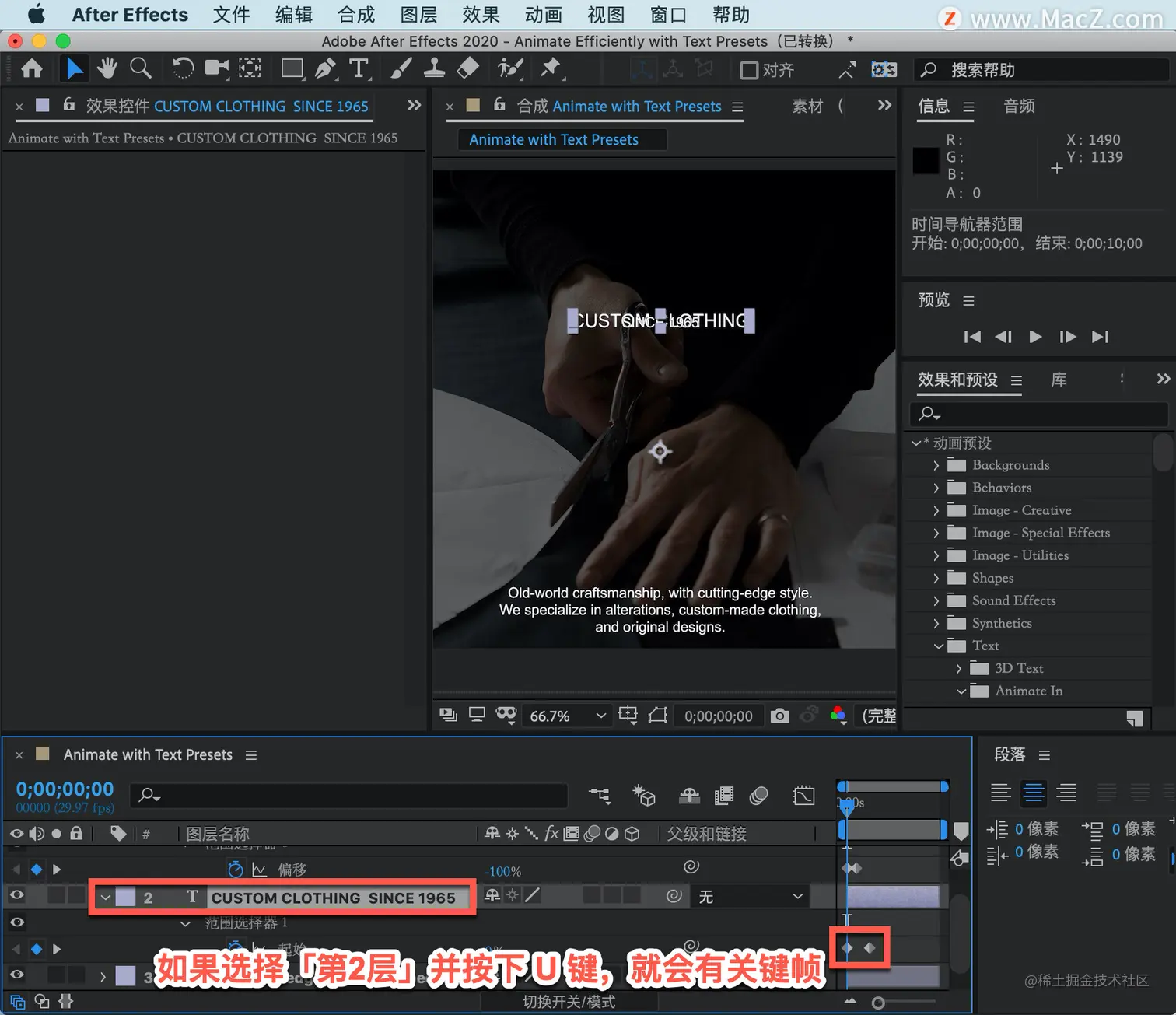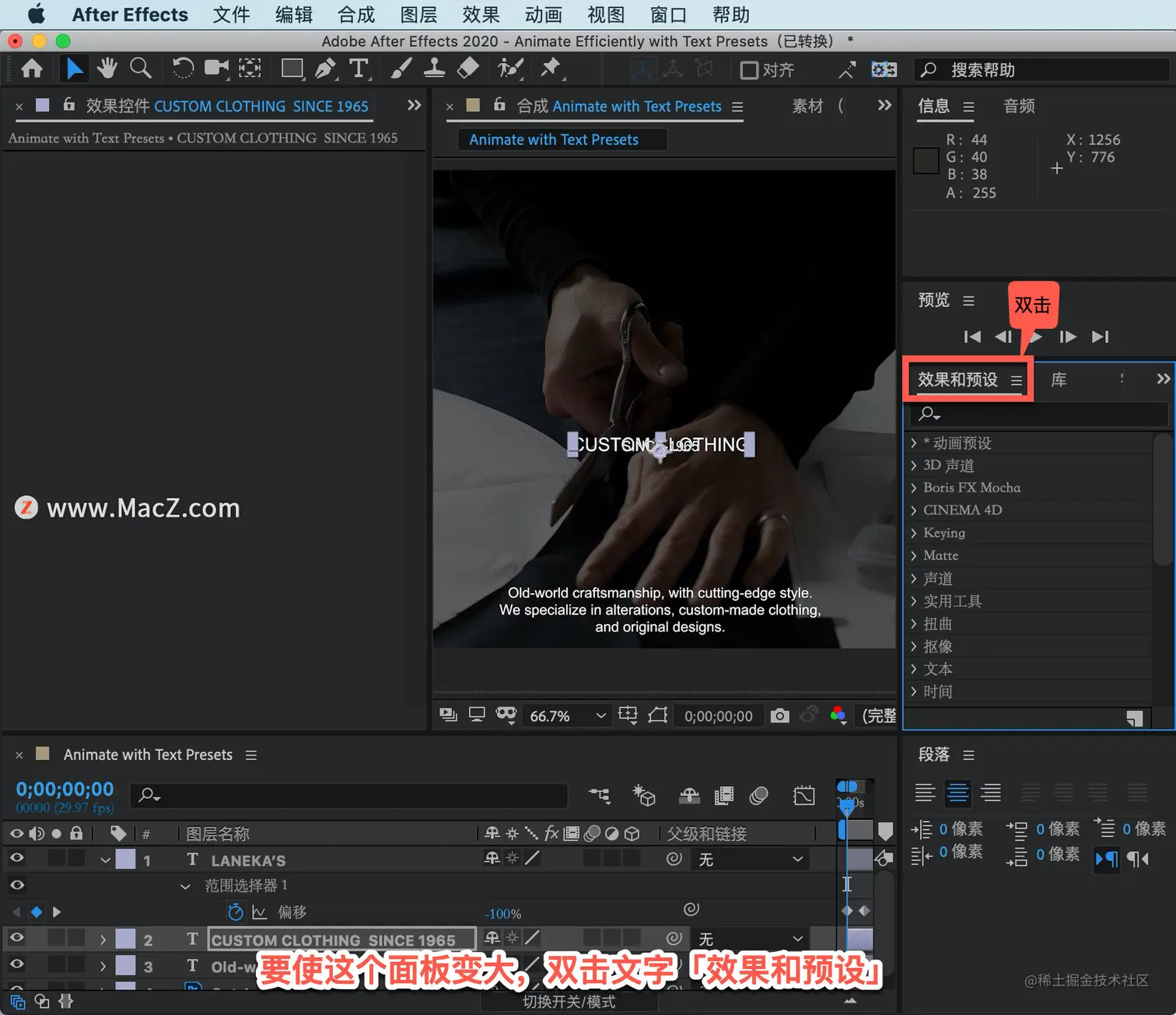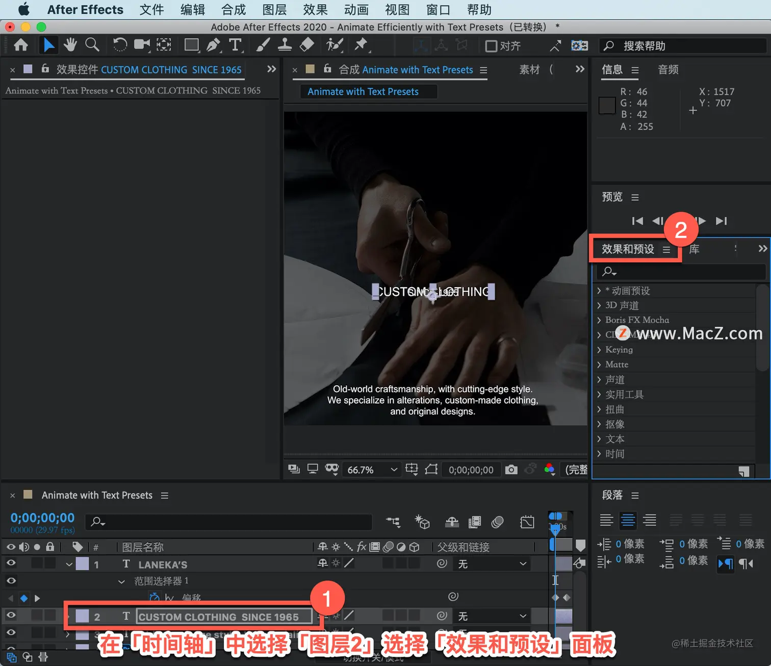 要设置下一个文本元素的动画,在「时间轴」中选择「图层2」。这次不用浏览预设来应用它们,选择「效果和预设」面板。