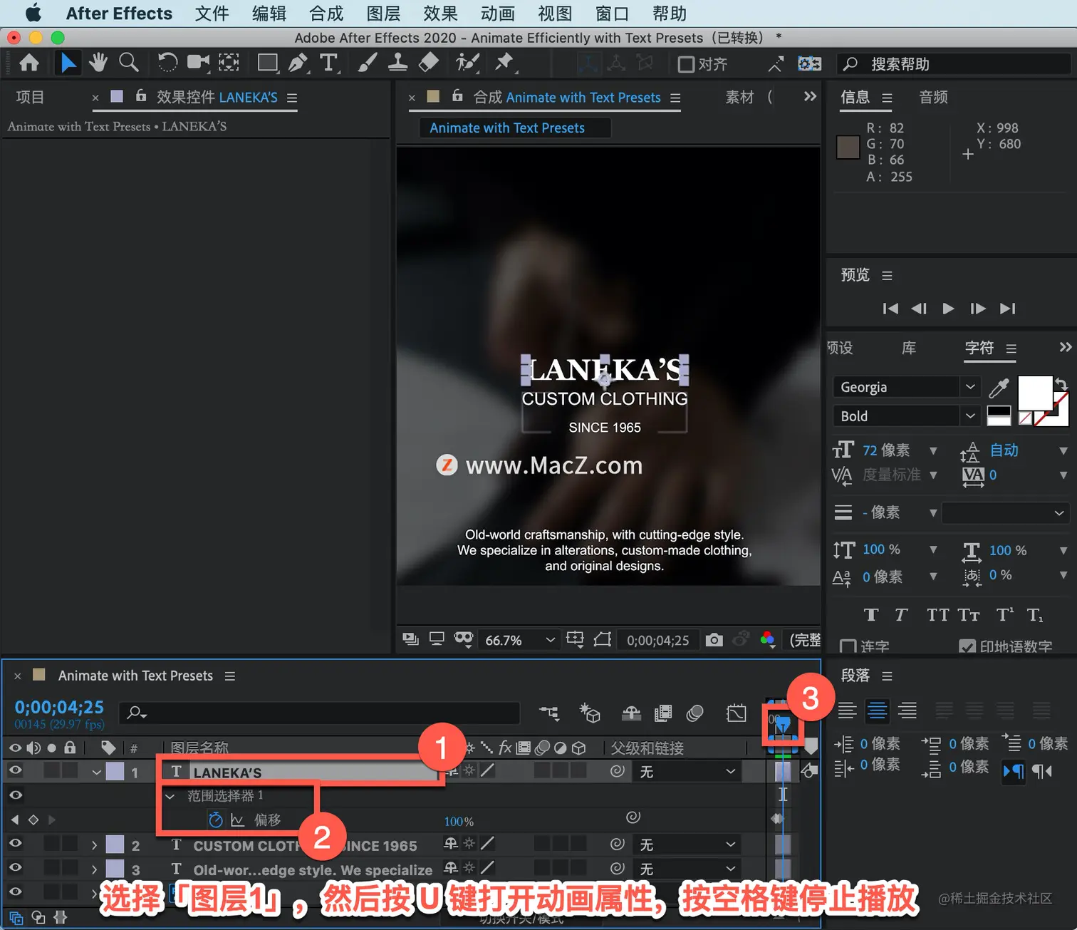 如果要更改动画的计时,选择「图层1」,然后按 U 键打开动画属性,按空格键停止播放。