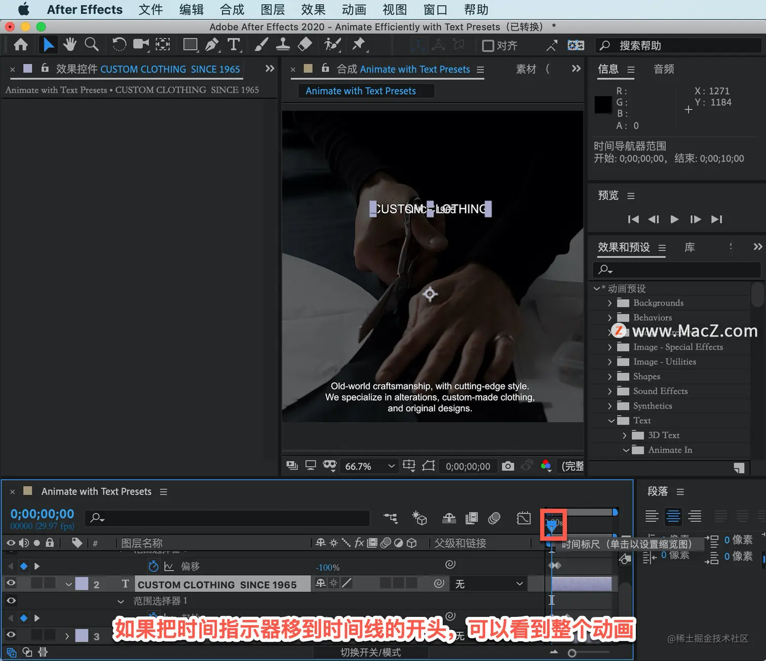 使用文本动画预设是一个很好的方法,可以了解更多关于 After Effects 中可能的内容。如果对预设的计时不满意,始终可以打开「时间轴」并滑动关键帧以进行调整。