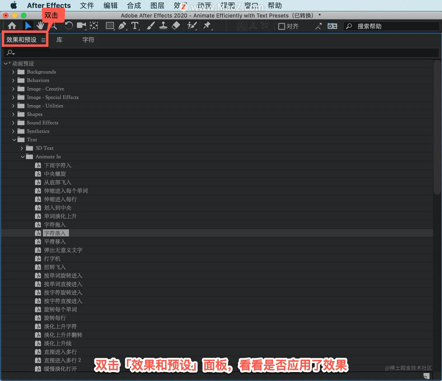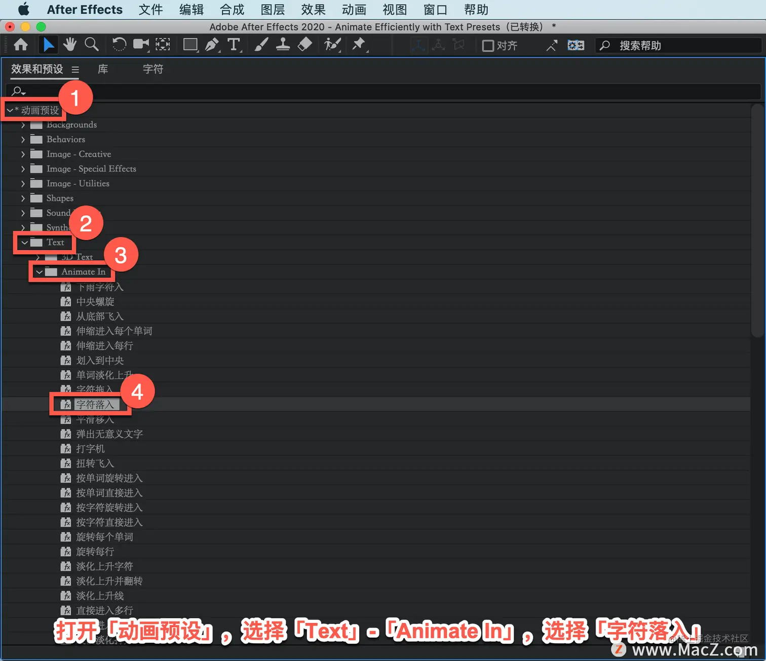 打开「动画预设」,选择「Text」-「Animate In」,选择「字符落入」双击这个效果。