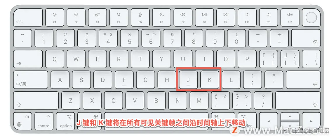 要将当前时间指示器移回这个关键帧,按键盘上的 J 键。如果当前时间指示器位于关键帧的另一侧,则需要按 K 键移动到关键帧。J 键和 K 键将在所有可见关键帧之间沿时间轴上下移动。