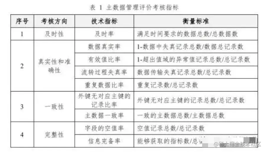 5)主数据管理评价主数据管理评价是用来评估及考核主数据相关责任人职责的履行情况及数据管理标准和数据政策的执行情况,通过建立定性或定量的主数据管理评价考核指标,加强企业对主数据管理相关责任、标准与政策执行的掌控能力。主数据管理评价指标从管理标准、数据认责和数据政策三个角度考虑,由数据所有人与数据认责人共同确定,定义一系列的衡量指标和规则,一方面落实和检查主数据的应用情况,另一方面考察和评估主数据管理、主数据标准、主数据质量的执行情况。