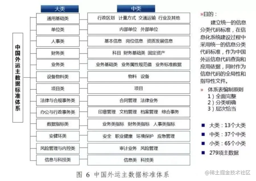 3)主数据代码体系表:在某些领域内,又称主数据资产目录。是描述企事业单位信息化建设过程中所使用的主数据代码种类、各类主数据代码名称、代码属性(分类、明细、规则等)、采(参)标号及代码建设情况的汇总表,是企业主数据代码查询和应用的依据,同时也是主数据代码的全局性和指导性文件。主数据代码体系表主要结合了企业的经营管理特点,服务于企业信息化建设,主要包括两部分内容,第一是企业信息代码体系表的框架结构以及分类,第二是所有分类下的信息代码标准明细以及建设情况。