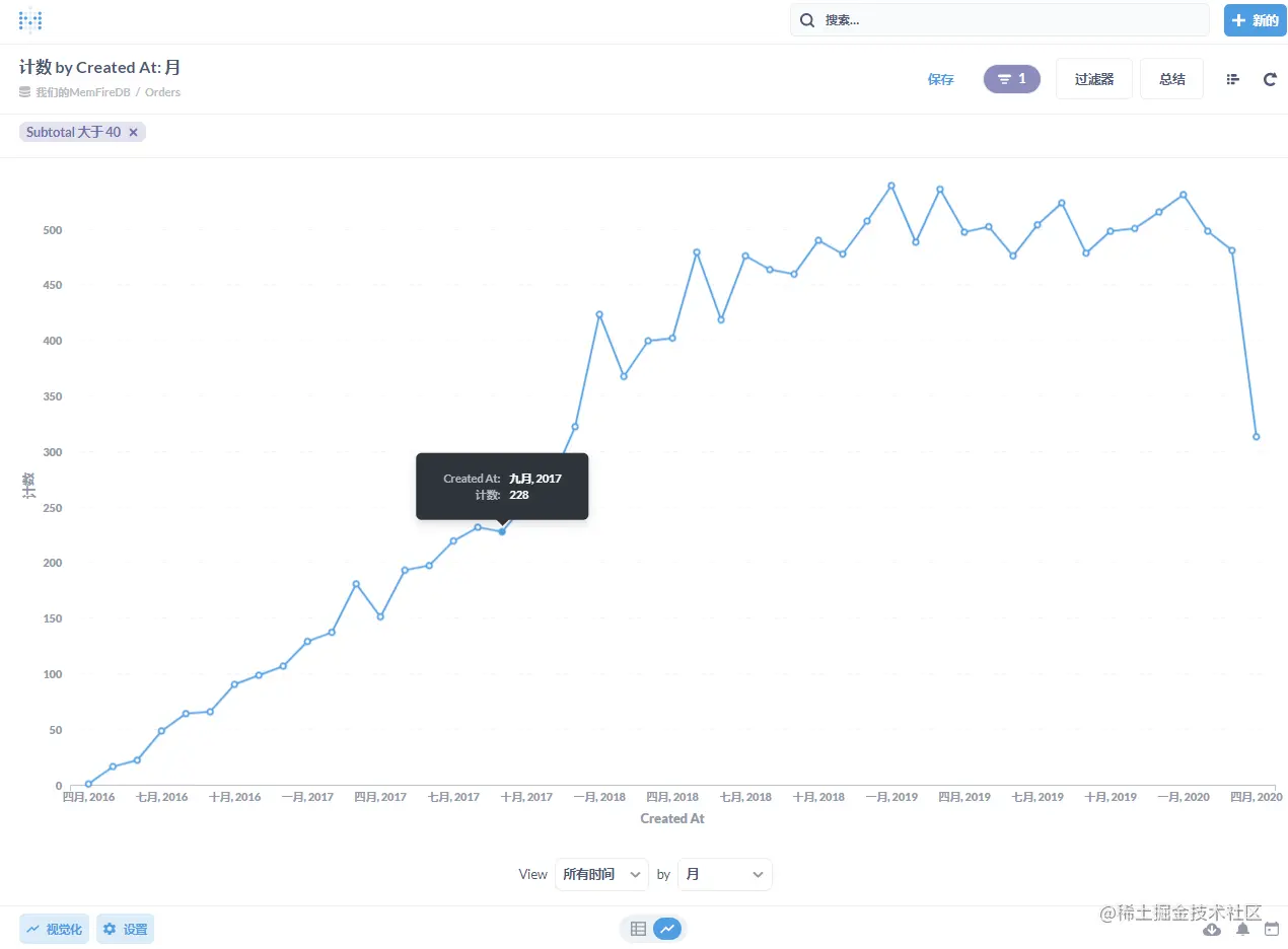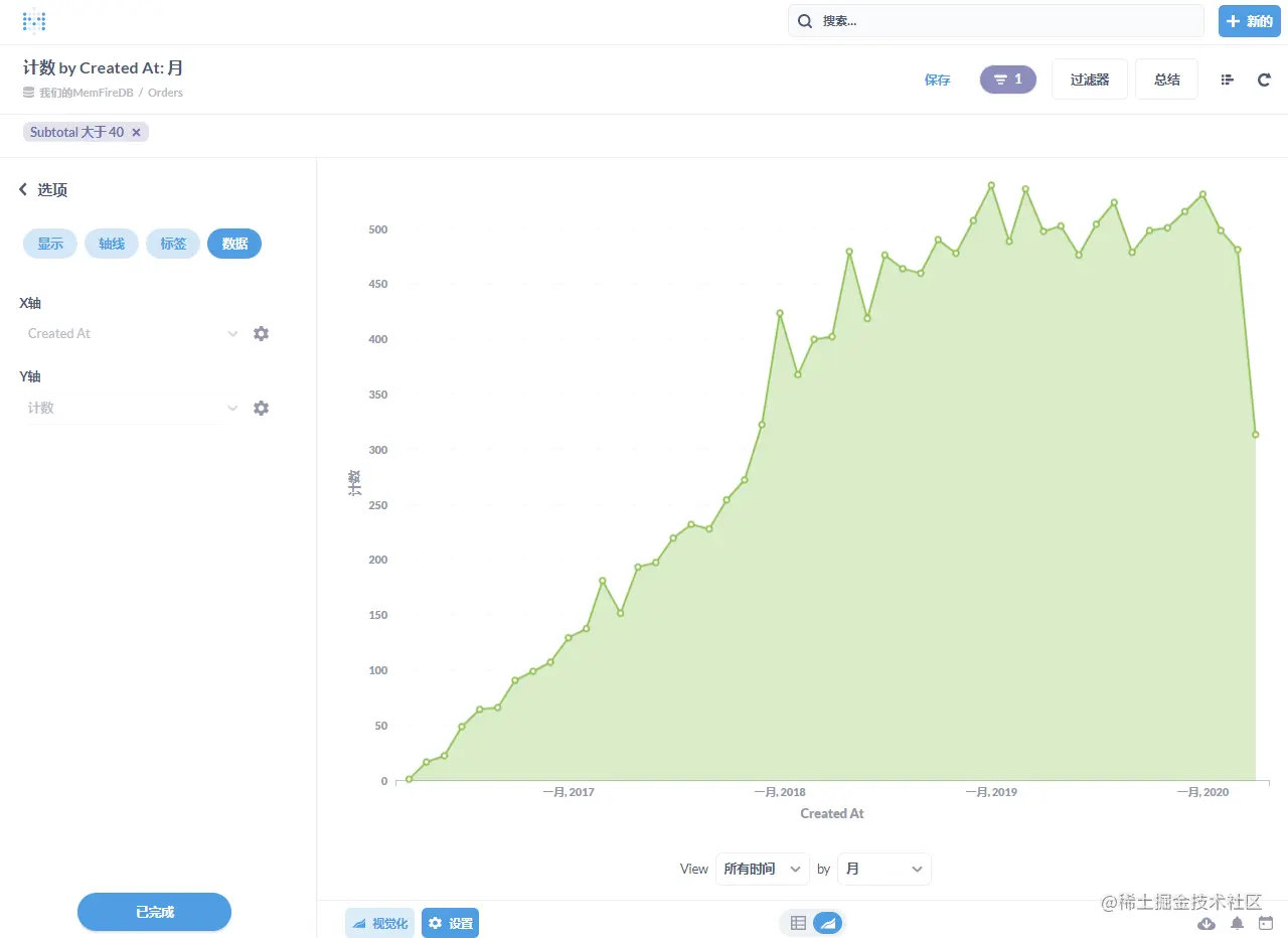 接下来我们希望按月进行分组,了解每个月多少个超过40美元的订单?那么可以选择总结,累计计数,单击旁边的按月Created At,如下图所示。