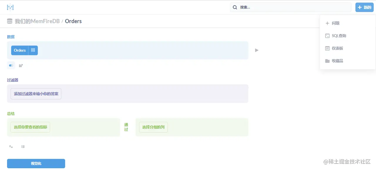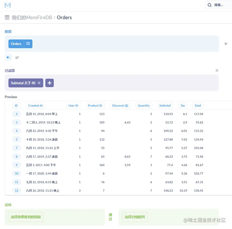 您可以通过过滤和总结其结果来处理问题,将这些探索保存为新问题,并将问题添加到仪表板. 对于接下来的几个示例,我们将使用 Metabase 中的我们的MemFireDB数据库。