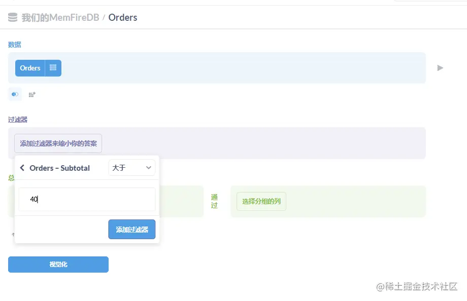 假设我们查询,有多少订单的价格大于40美元?为了找出答案,我们想按我们感兴趣的字段过滤数据,在本例中是Subtotal. 然后我们要计算过滤后的行数。