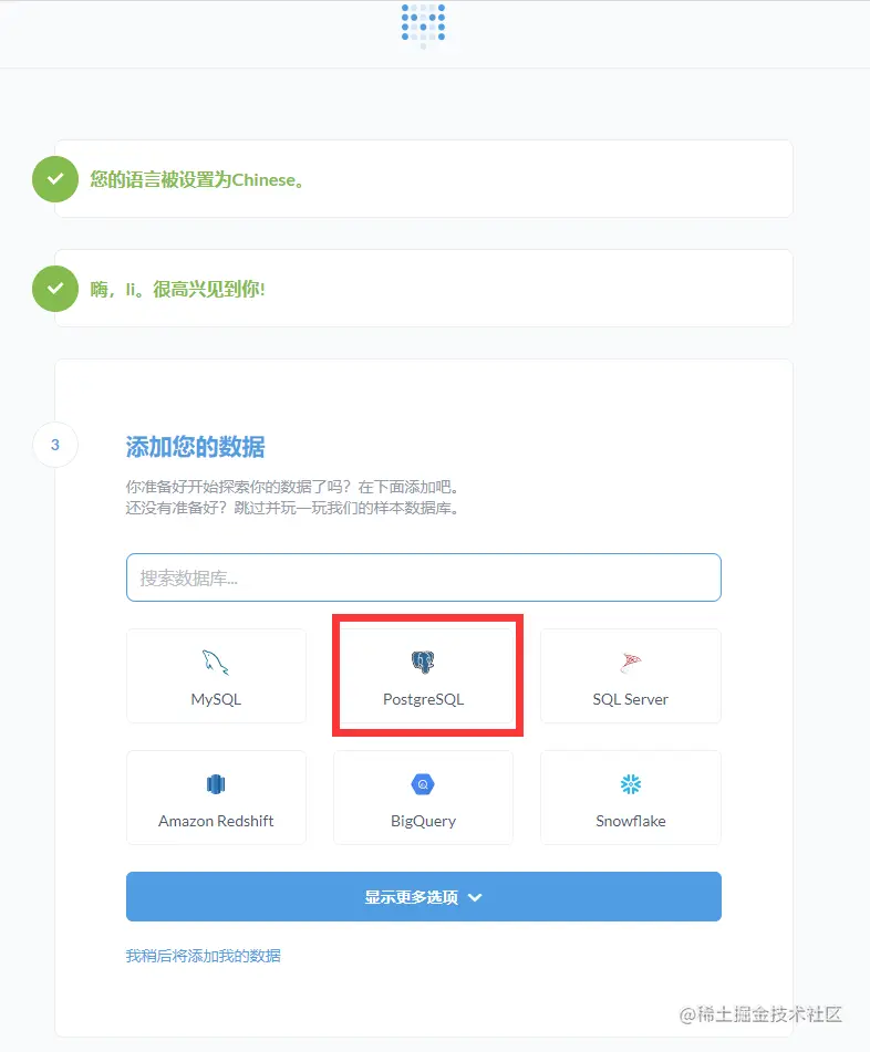 在 Metabase 上输入必要数据库连接信息,点击下一步,将进入 Metabase 主页,在数据->浏览数据栏可以查看刚刚配置的数据.。