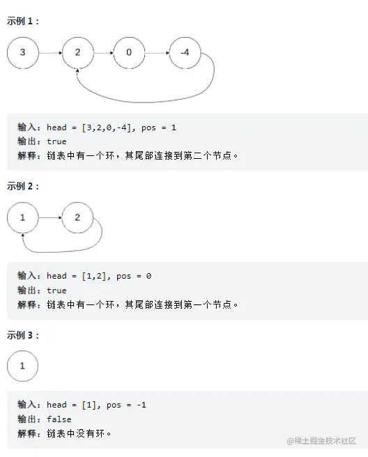 如果链表中有某个节点,可以通过连续跟踪 next 指针再次到达,则链表中存在环。 为了表示给定链表中的环,评测系统内部使用整数 pos 来表示链表尾连接到链表中的位置(索引从 0 开始)。如果 pos 是 -1,则在该链表中没有环。注意:pos 不作为参数进行传递,仅仅是为了标识链表的实际情况。