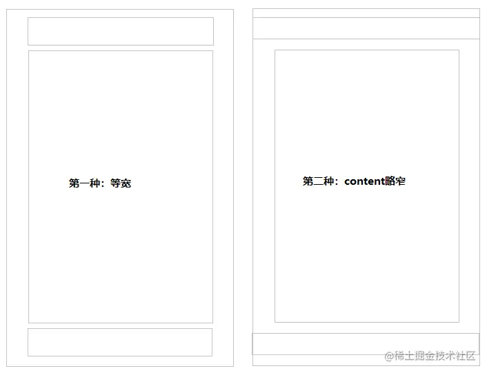 对于第二种,header 和 footer 可以不用设置宽度,让其充满整个屏幕(默认100%),只需将三者的内容设置同一个 width ,然后在通过 margin:auto 让其内容居中