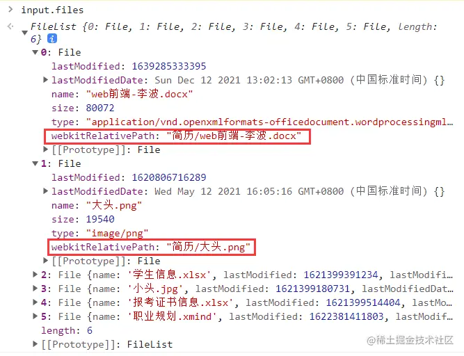 点击上传就会上传我的“简历”文件夹下所有文件,这时我们再在控制台打印 input.files,得到如下结果: