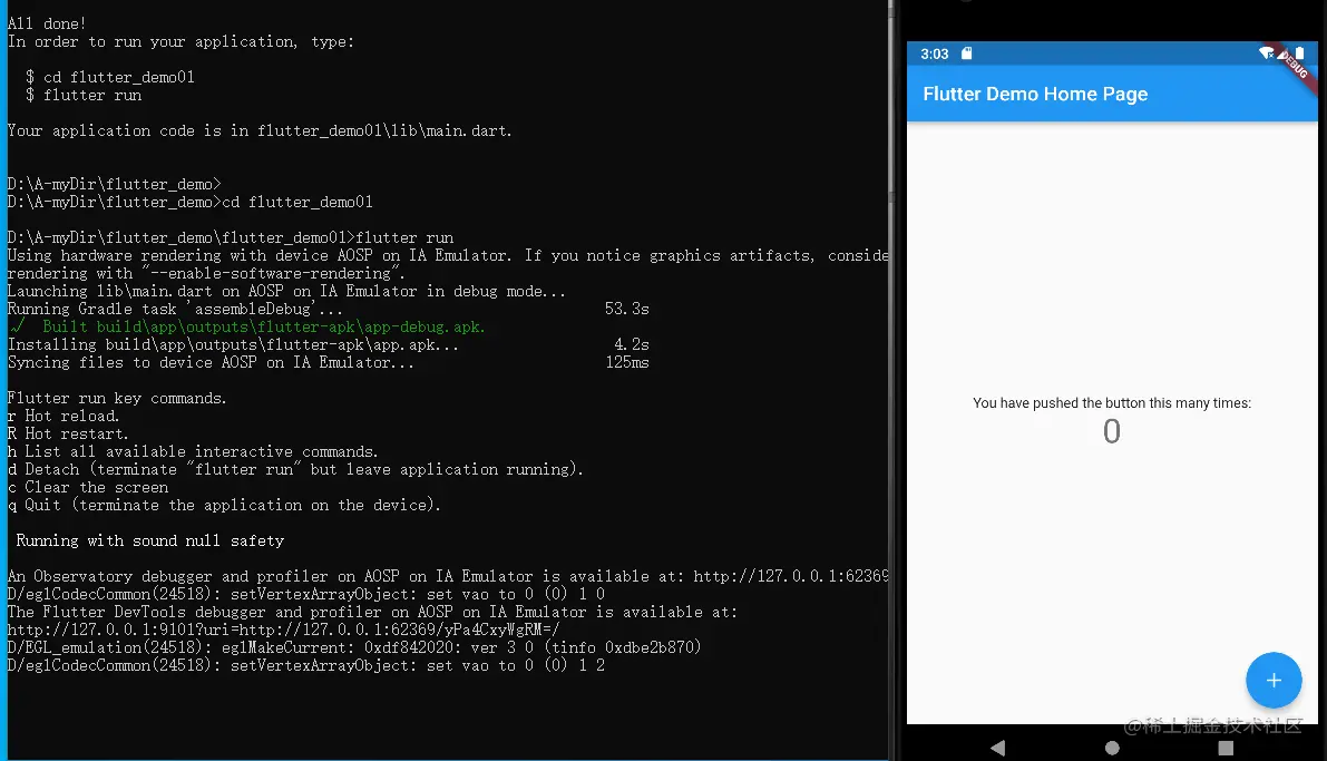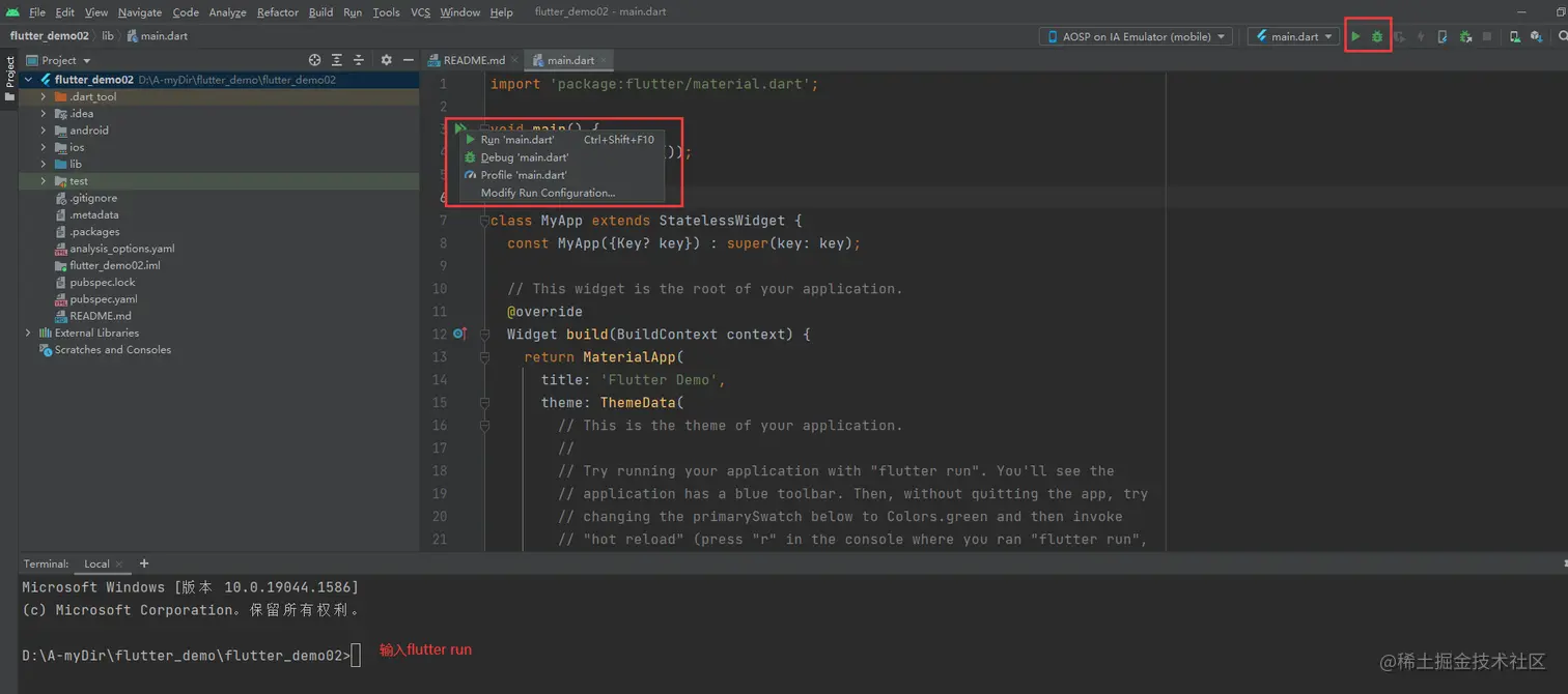进入项目根目录中,执行 flutter run 命令运行项目: