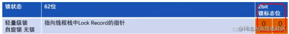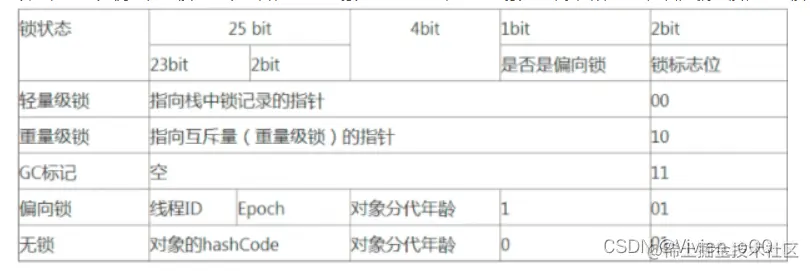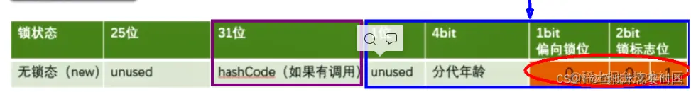 以32位系统为例:在无锁状态下包含,25Bit对象的hashcode、4bit 对象的分代年龄、1bit 是否是偏向锁、2bit 锁标志位